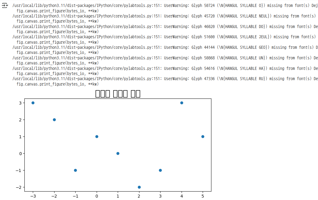 import warnings warnings.filterwarnings('ignore')plt.figure(figsize=(8,4)) plt.title('오늘도 즐거운 하루', fontsize=20) plt.scatter(x, y) plt.show()