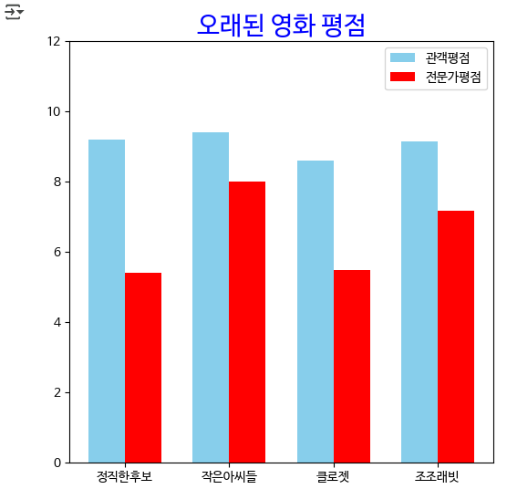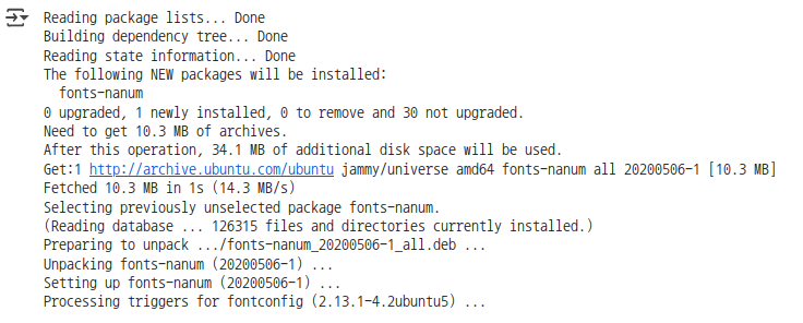 # 현재 사용중인 폰트 확인 plt.rcParams['font.family'] # 한글폰트 설치하기 위해 필요한 모듈 import matplotlib.font_manager as fm # 나눔바른고딕 폰트 설치 - 런타임 연결이 다시 될 때마다 다시 폰트를 설치해야 한글이 보인다. !apt install fonts-nanum fm.fontManager.addfont('/usr/share/fonts/truetype/nanum/NanumBarunGothic.ttf') plt.rcParams['font.family'] = "NanumBarunGothic"