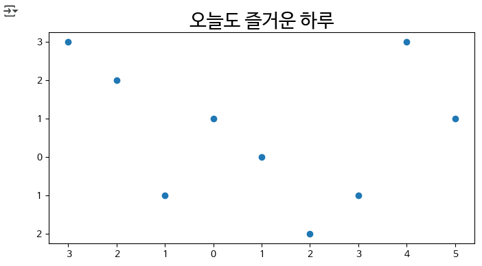 # 마이너스(음수)부호 설정 plt.rc("axes", unicode_minus = False) plt.figure(figsize=(8,4)) plt.title('오늘도 즐거운 하루', fontsize=20) plt.scatter(x, y) plt.show()