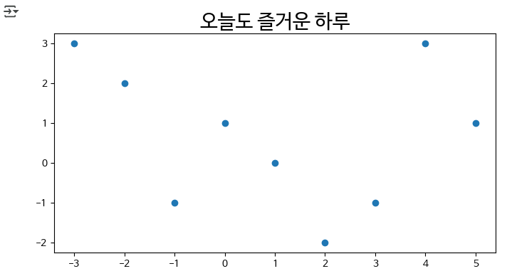 x = [-3, -2, -1, 0, 1, 2, 3, 4, 5] y = [3, 2, -1, 1, 0, -2, -1, 3, 1] plt.figure(figsize=(8,4)) plt.title('오늘도 즐거운 하루', fontsize=20) plt.scatter(x, y) plt.show()
