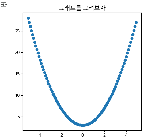 # figure 크기 조정하기 plt.figure(figsize=(5,5)) plt.title('그래프를 그려보자', fontsize=15) plt.scatter(x, y1) plt.show()