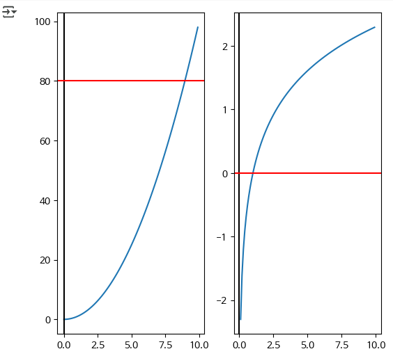 x = np.arange(0, 10, 0.1) y1 = x ** 2 y2 = np.log(x) fig = plt.figure() axs = fig.subplots(1,2) axs[0].plot(x, y1) axs[1].plot(x, y2) axs[0].axvline(x=0, color = 'k') # draw x=0 axes (Y축) axs[0].axhline(y=80, color = 'r') # draw y=0 axes (X축) axs[1].axvline(x=0, color = 'k') # draw x=0 axes (Y축) axs[1].axhline(y=0, color = 'r') # draw y=0 axes (X축) plt.show()