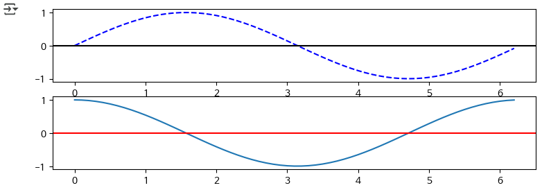 fig = plt.figure(figsize=(9,3)) axs = fig.subplots(2, 1) x=np.arange(0, 2*np.pi, 0.1) sin_y=np.sin(x) cos_y=np.cos(x) axs[0].plot(x,sin_y, 'b--') axs[0].axhline(y=0, color='k') axs[1].plot(x,cos_y) axs[1].axhline(y=0, color = 'r') plt.show()