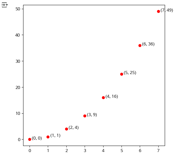 x = np.arange(8) y = x**2 fig, ax = plt.subplots() ax.plot(x, y, 'ro') for x_, y_ in zip(x, y): t = '(%d, %d)'%(int(x_), int(y_)) ax.text(x_+0.1, y_+0.1,t)