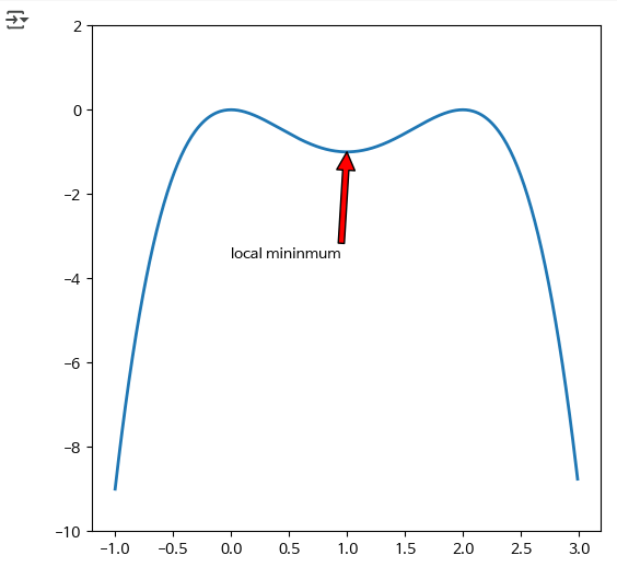 ax.annotate('local mininmum', xy=(1, -1), xytext=(0, -3.5),