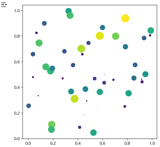 ax.scatter(x, y, s=area, marker='o', c=area)