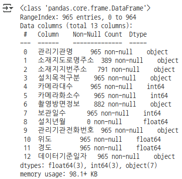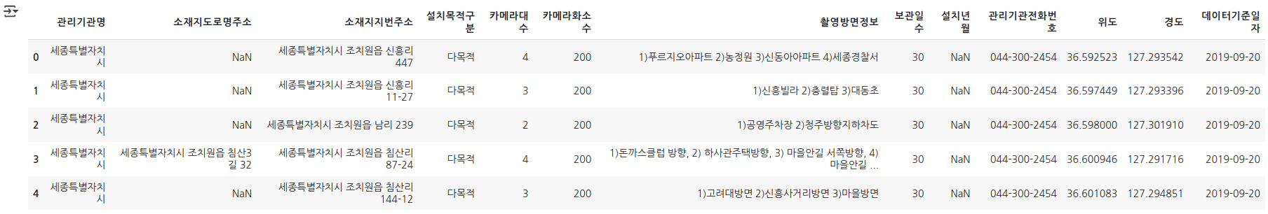 import pandas as pd cctv = pd.read_csv('https://github.com/SkyLectures/LectureMaterials/raw/refs/heads/main/datasets/S01-01-04-04_01-SejongCCTV.csv', encoding='cp949') cctv.head()