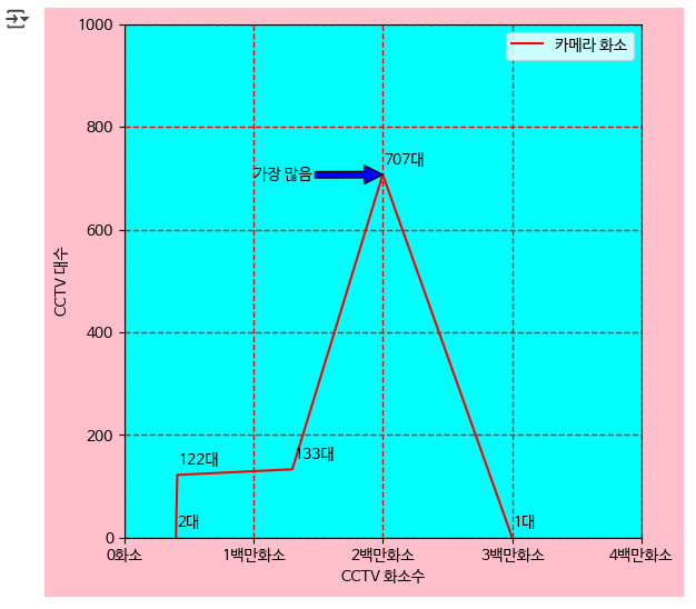 fig, ax = plt.subplots() ax.plot(data.index, data.values, label='카메라 화소', color='r') ax.set_xlim([0, 400]) ax.set_ylim([0, 1000]) ax.set_xticks([0,100,200,300,400]) ax.set_xticklabels(['0화소','1백만화소','2백만화소','3백만화소','4백만화소']) ax.legend(loc='upper right') ax.set_xlabel('CCTV 화소수') ax.set_ylabel('CCTV 대수') for x_, y_ in zip(data.index, data.values): ax.text(x_+1, y_+20, '%d대'%int(y_)) ax.annotate('가장 많음', xy=(200,707), xytext=(100,700),arrowprops=dict(facecolor='blue')) ax.set_facecolor('cyan') fig.set_facecolor('pink') ax.grid(color='r', linestyle='--', linewidth=1) plt.show()