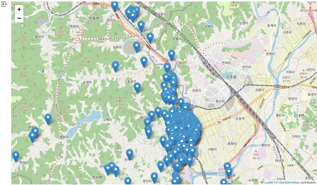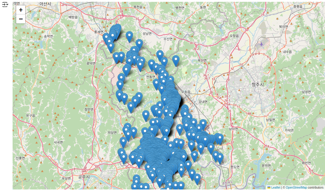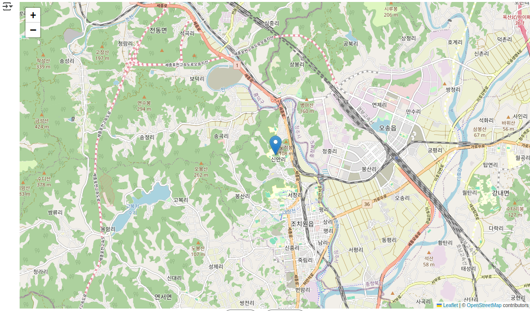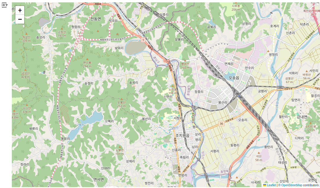 mymap = folium.Map(location=[36.6208541,127.2849716], zoom_start=11) # 위도, 경도, 축척