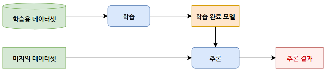 - 학습: 학습용 데이터셋으로부터 특징을 추출하여 추출된 특징을 표현하는 AI 모델을 구성하는 과정