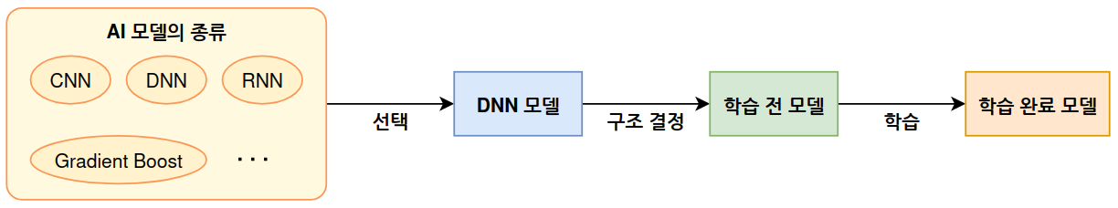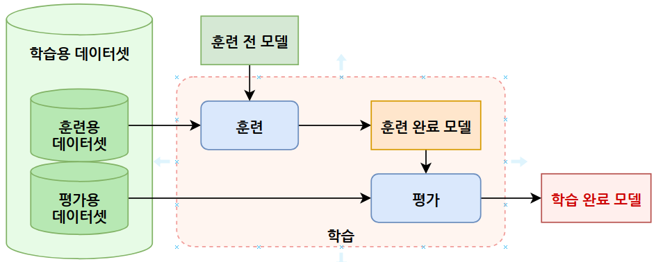 - 평가: 훈련의 결과로 얻은 AI 모델이 적절한 추론을 수행할 수 있는지 판별하는 작업