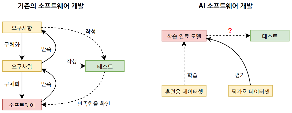 - 따라서 기존 소프트웨어의 테스트 기법을 적용할 수 없음