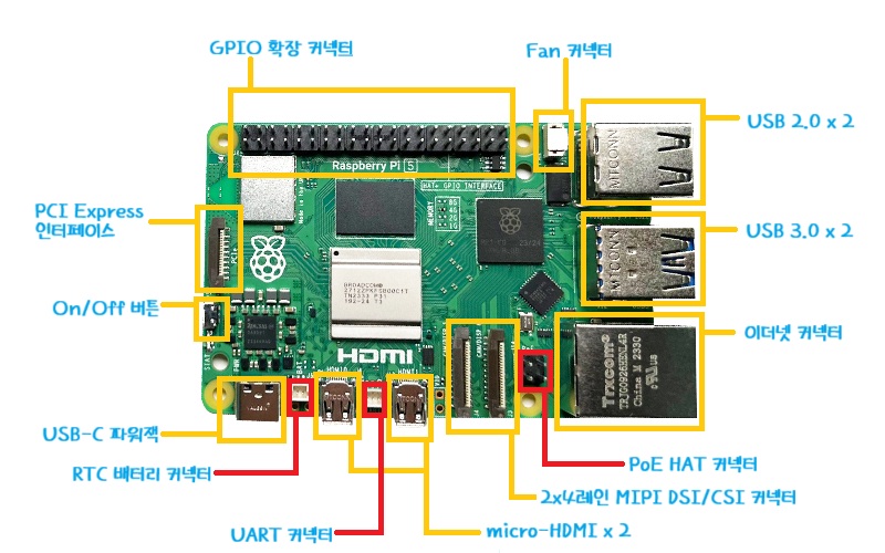- 컴퓨터 칩(SoC)에 직접 연결된 GPIO 확장 커넥터 핀도 돌출되어 있어서 정전기 등 과도한 전압이 걸리면 SoC가 파손될 수 있음