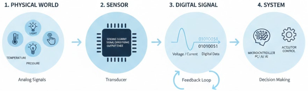 센서는 전체 시스템(AI, 로봇, IoT 등)에서 다음과 같은 결정적인 역할을 수행함