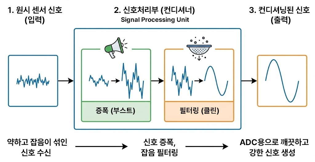 - 신호 처리부는 “작고 지저분한 전기 신호를 크고 깨끗한 디지털 숫자로 만드는 필터이자 번역기”